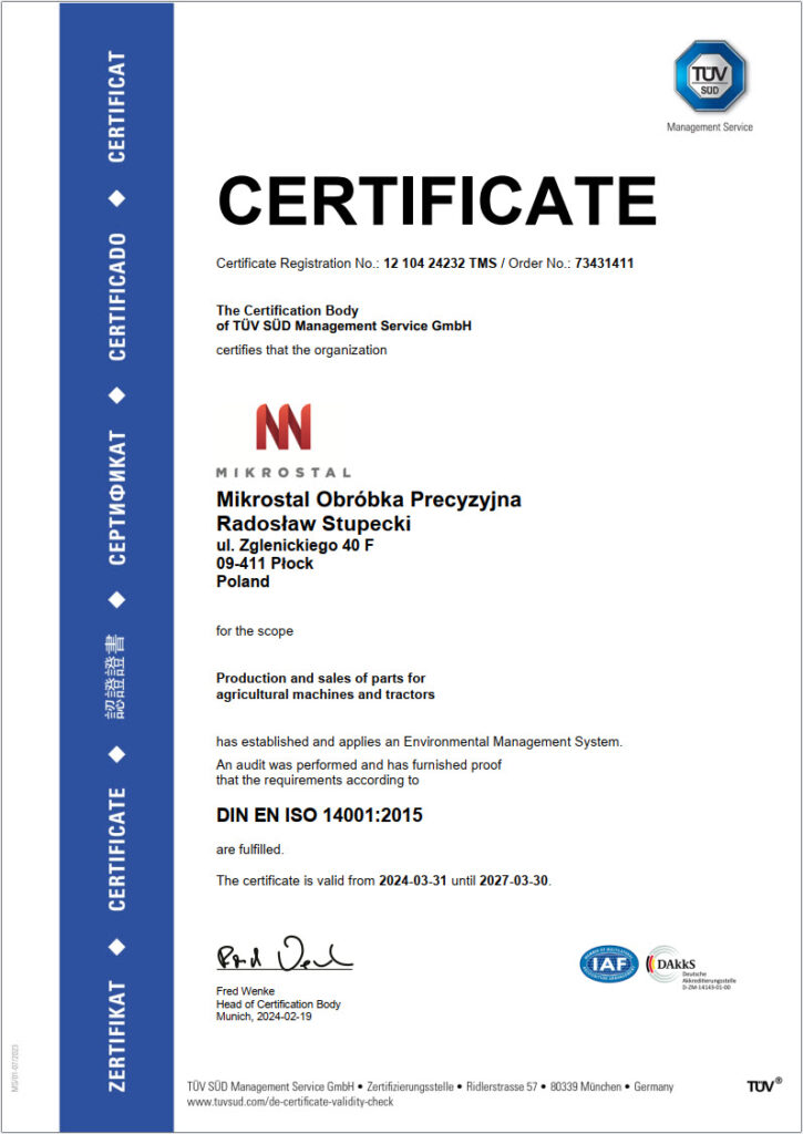 Dodatkowo cały proces produkcji poddawany jest rygorystycznym standardom jakości, wyznaczonym przez normy ISO 9001 : 2015 oraz ISO 14001 : 2015. Wykorzystujemy tylko sprawdzone procedury i narzędzia zarządzania jakością, które wpływają pozytywnie na proces produkcji i finalny produkt. Ciągle doskonalimy się w zakresie technologii, produkcji, kształcenia personelu. Nasze wyroby są poddawane kontroli specjalistów i produkowane w zgodzie z normami jakości. Przykładamy dużą wagę, by nawet najmniejsza partia naszych wyrobów została zaakceptowana przez Klienta. Dzięki temu możemy z sukcesem wdrażać normy ISO 9001 : 2015 w codziennej produkcji, podnosząc zadowolenie Klientów i doskonalić skomplikowany proces obróbki precyzyjnej.