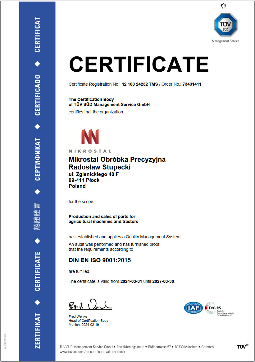 Dodatkowo cały proces produkcji poddawany jest rygorystycznym standardom jakości, wyznaczonym przez normy ISO 9001 : 2015 oraz ISO 14001 : 2015. Wykorzystujemy tylko sprawdzone procedury i narzędzia zarządzania jakością, które wpływają pozytywnie na proces produkcji i finalny produkt. Ciągle doskonalimy się w zakresie technologii, produkcji, kształcenia personelu. Nasze wyroby są poddawane kontroli specjalistów i produkowane w zgodzie z normami jakości. Przykładamy dużą wagę, by nawet najmniejsza partia naszych wyrobów została zaakceptowana przez Klienta. Dzięki temu możemy z sukcesem wdrażać normy ISO 9001 : 2015 w codziennej produkcji, podnosząc zadowolenie Klientów i doskonalić skomplikowany proces obróbki precyzyjnej.